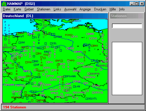 Durch Anklicken mit der Maus auf der Karte oder durch Eingabe des Rufzeichens kann eine beliebige Station ausgewählt werden.Diese Station blinkt dann in der